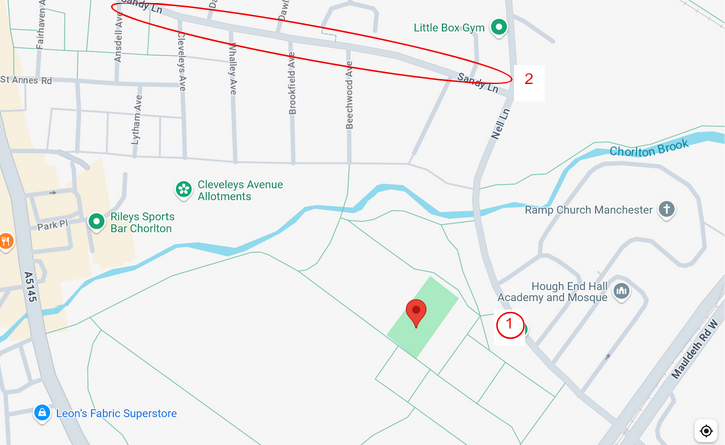 The area circled at number 2 around Sandy Lane, M21 8TZ can be a useful area for on street parking, as the pedestrian access to the park at the end of Beechwood Ave can then be used. However, please ensure you are considerate if parking in this residential area.
